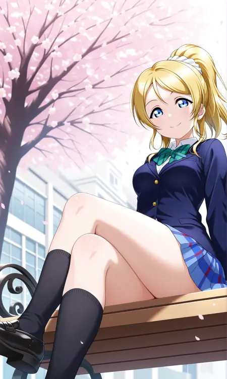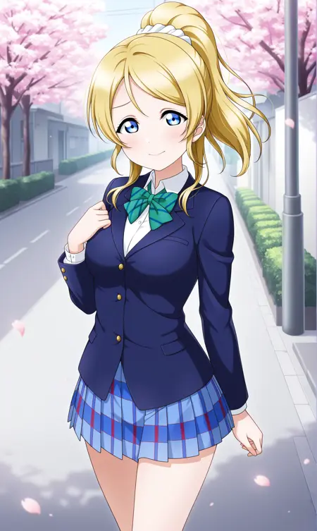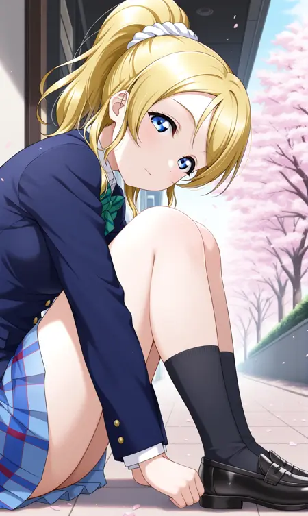 ayase eli, ponytail, long hair, blue eyes, blonde hair, hair scrunchie, white scrunchie
