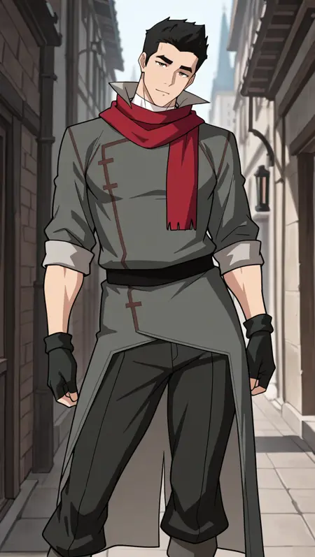 grey casual top, white undershirt, red scarf, black fingerless gloves, black waist sash, black pants, grey knee gaiters, black shoes