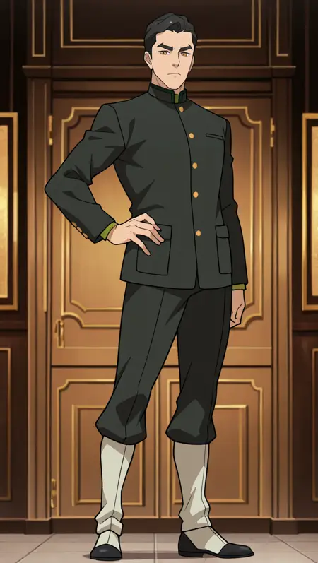 slicked back hair, green undershirt, black uniform top, grey knee gaiters, black uniform pants, black shoes