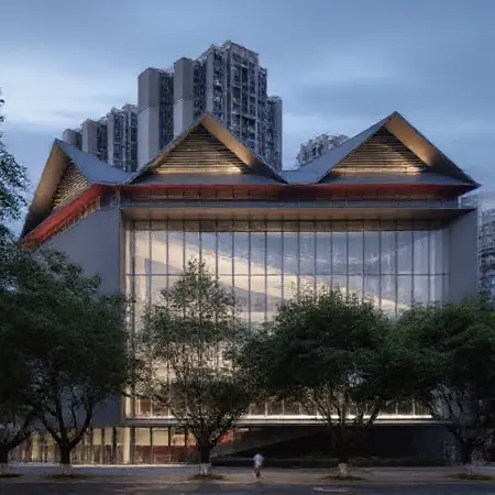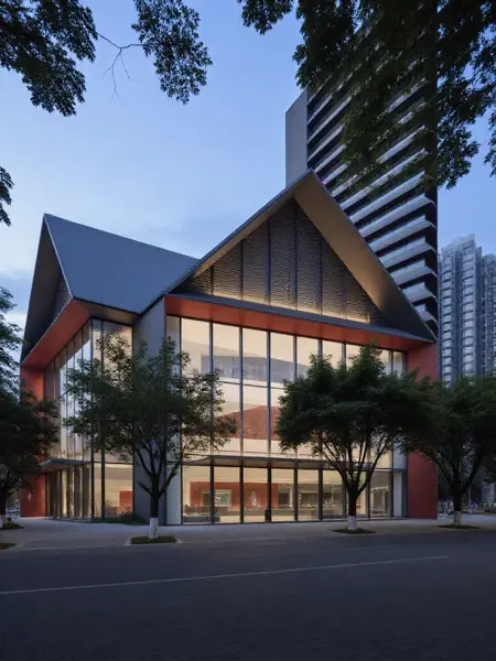 WD,这张照片捕捉了一座现代三角屋顶建筑在黄昏时分的景象,其大面积玻璃窗映照着傍晚的光线。建筑立面由红色和灰色调组成。周围是茂密的绿树,相邻处可见摩天大楼,构成都市背景。场景宁静,柔和的光线与阴影营造出平和的氛围。