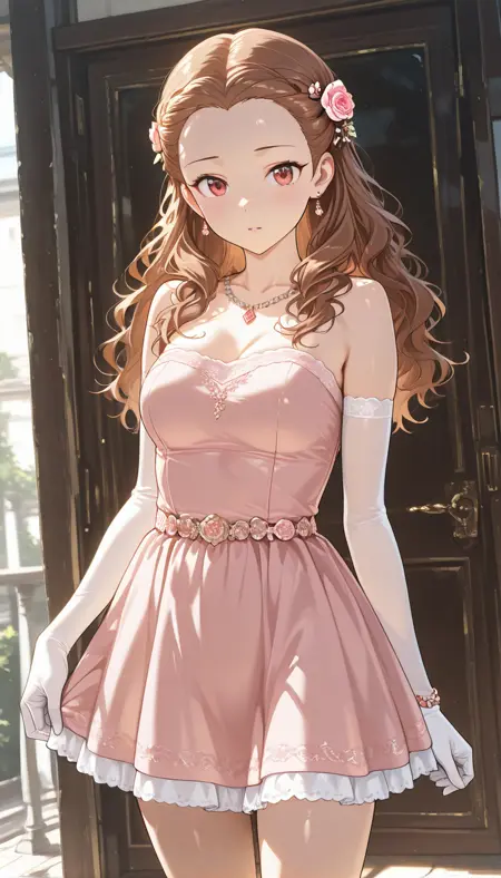 머리 장식, 장갑, 드레스, 보석, 어깨 노출, 관절뼈, 꽃, 귀걸이, 팔꿈치 장갑, 흰색 장갑, 머리 꽃, 목걸이, 스트랩리스, 장미, 짧은 드레스, 분홍 드레스, 분홍 꽃, 스트랩리스 드레스, 분홍 장미, 진주 목걸이, 팔찌, 비즈, 허벅지,