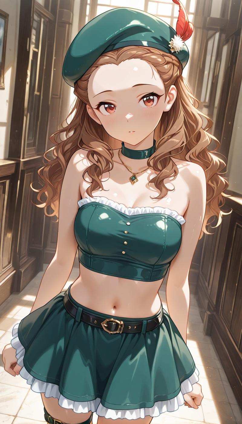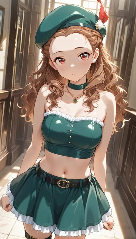 치마, 모자, 보석, 어깨 노출, 관절뼈, 프릴, 초크, 벨트, 허리, 미니스커트, 크롭탑, 스트랩리스, 팔 노출, 허벅지 스트랩, 베레모, 프릴 치마, 깃털, 녹색 치마, 버클, 녹색 헤어웨어, 튜브탑, 모자 깃털, 녹색 초크, 목걸이,