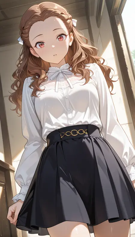 셔츠, 치마, 관절뼈, 흰색 셔츠, 단발목, 프릴, 풍선 소매, 풍선 단발목 소매, 스트랩, 프릴 소매, 고 Waist 치마, 갈색 치마, 스트랩 치마, 프릴 셔츠, 허벅지,
