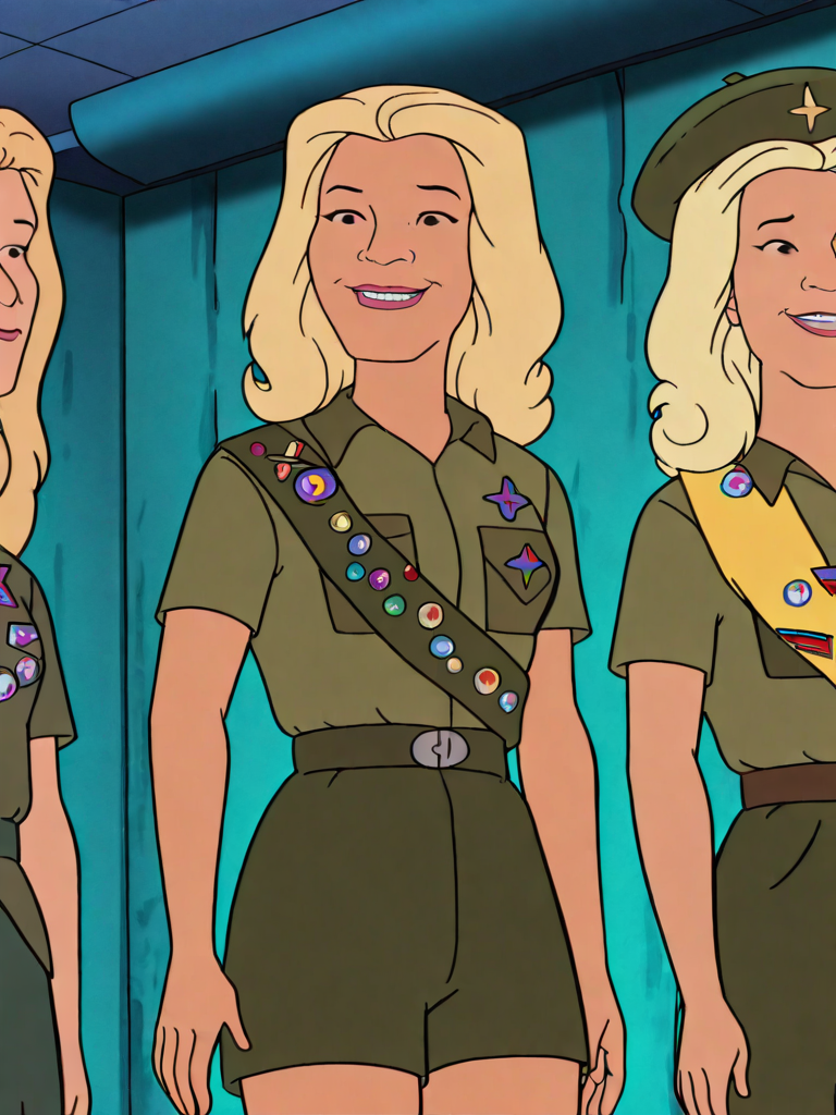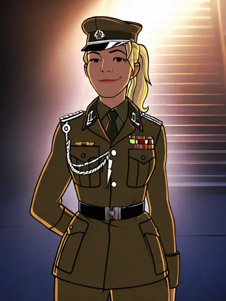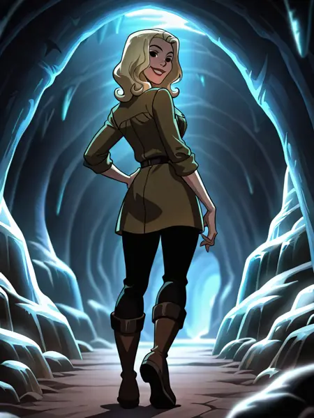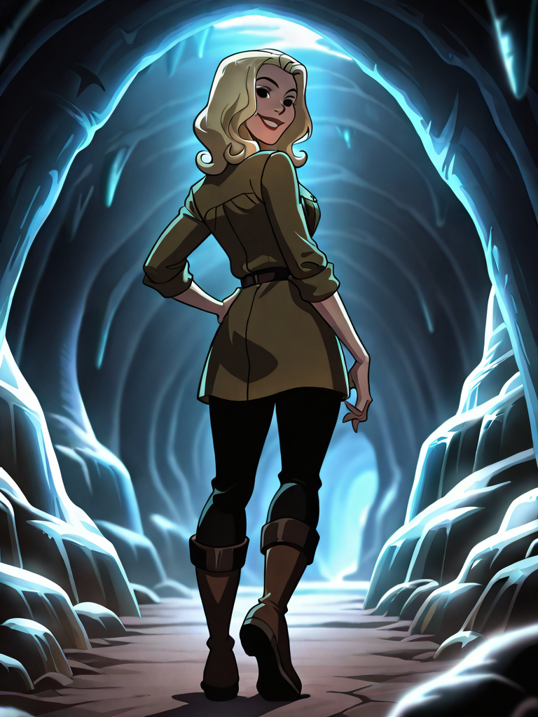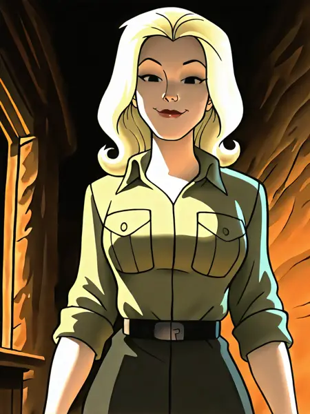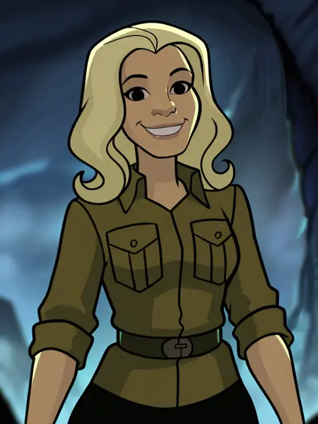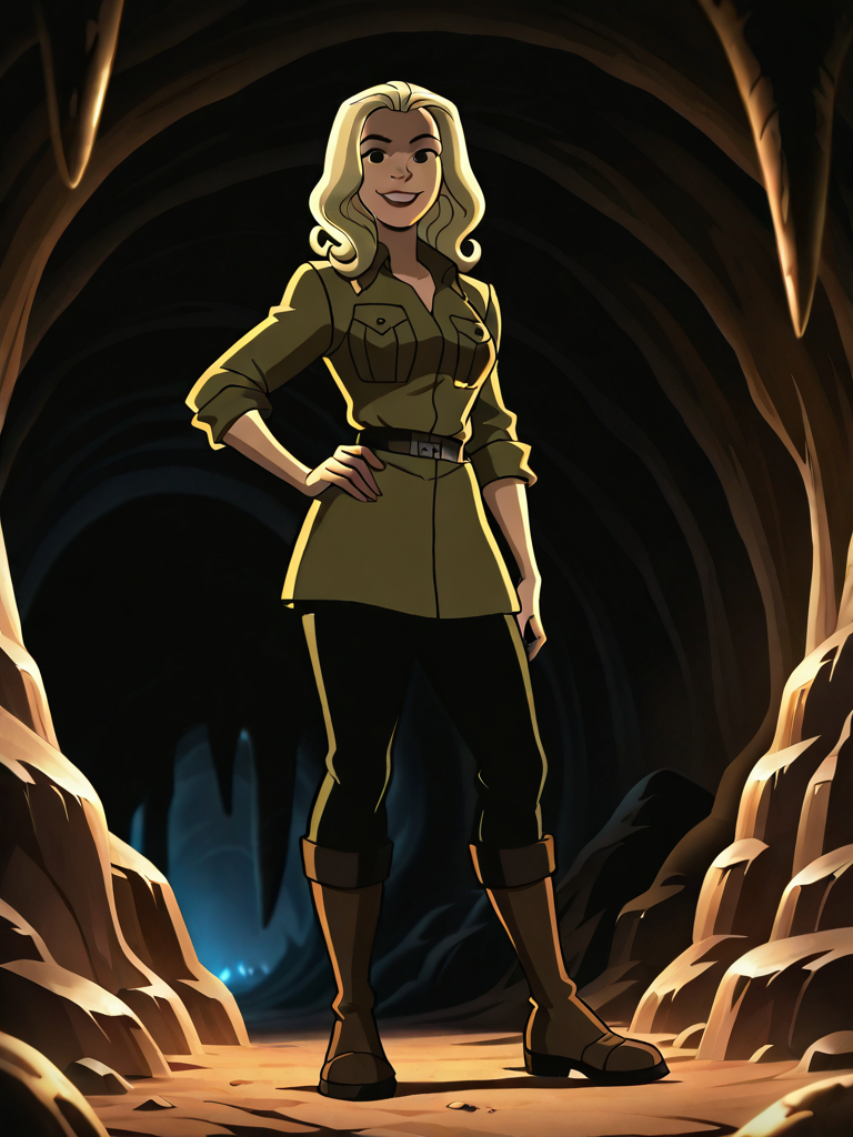 プロンプト: svankmajer, 考古学者の服装, 長い髪, 金髪, 黒い目, ベルト, 袖をまくった, リップストック, 胸ポケット, 黒いズボン