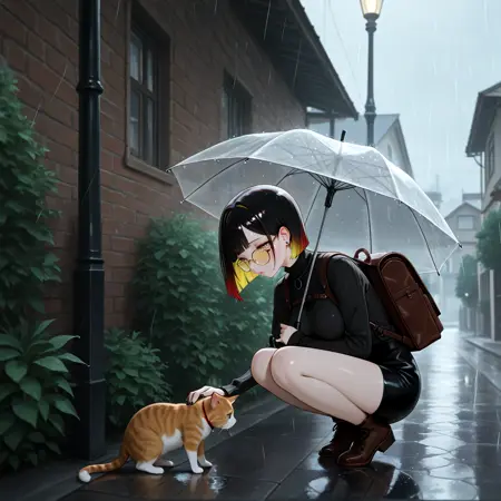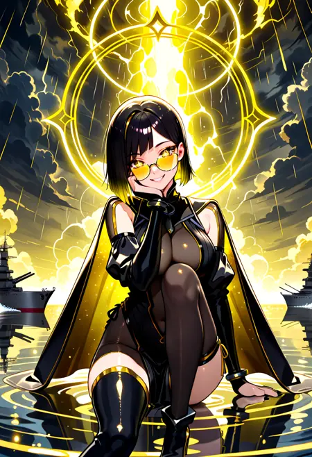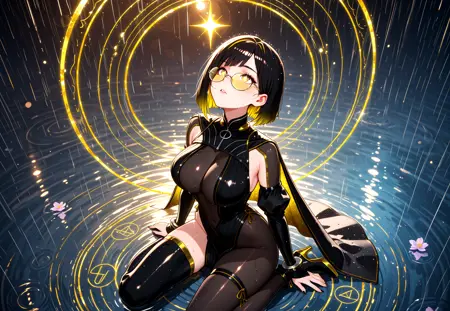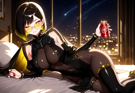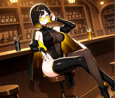 short hair, black hair, yellow hair, two-tone hair, asymmetrical hair color, straight hair, bangs, yellow eyes,, symbol-shaped pupils, glasses, yellow eyewear, black nails, large breasts,