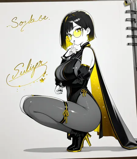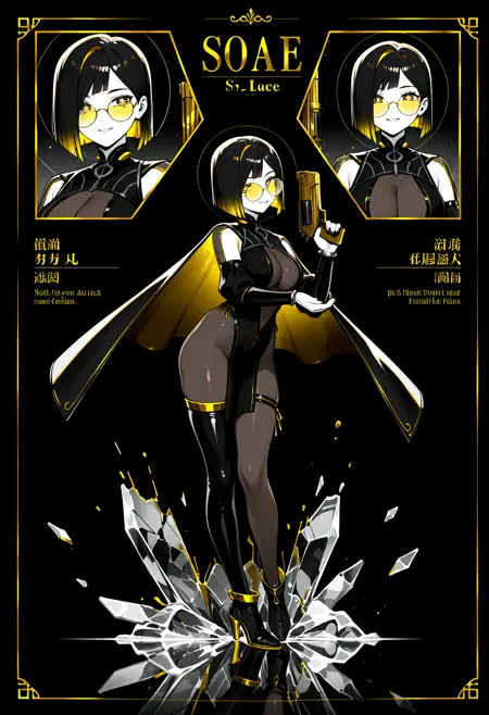 two-sided cape, black cape, yellow inner lining, starry inner lining, high collar, detached sleeves, black see-through bodysuit, gold accents, pelvic curtain, asymmetrical legwear, single thighhigh, thigh strap, gold trim high heels,mature female,