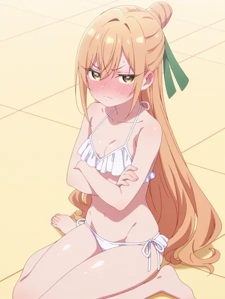 카라네 수영복(복장), 수영복, 비키니, 흰색 비키니, 맨발, 프릴이 달린 비키니, 사이드 타이 비키니 하의,