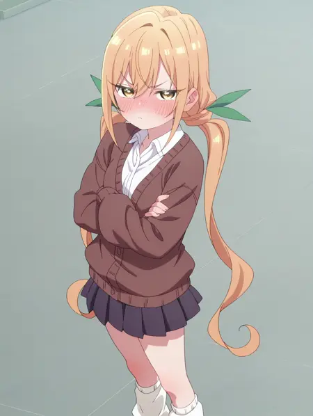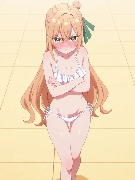 카라네 인다(캐릭터), 긴 머리, 금발, 눈 사이의 머리카락, 노란색 눈, 작은 가슴,