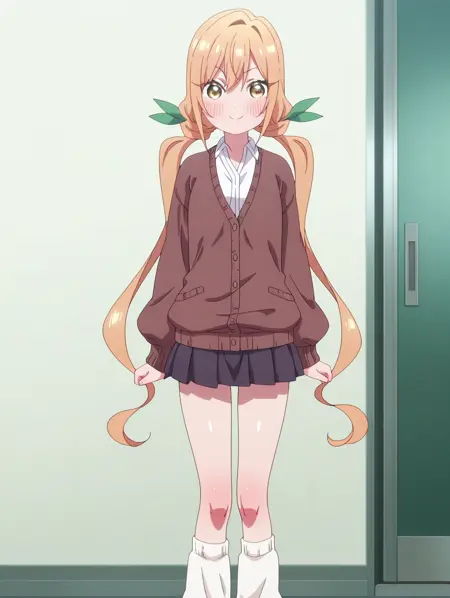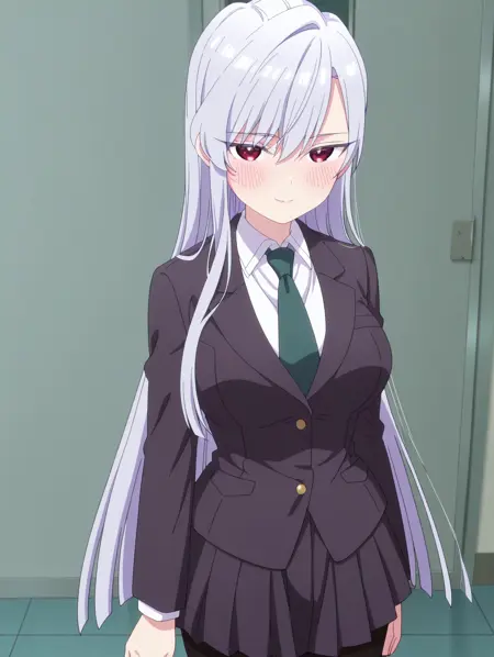 시즈카 유니폼(복장), 흰색 셔츠, 스웨터 조끼, 긴 소매, 리본, 칼라 셔츠, 학교 유니폼, 긴 치마, 팔찌, 주름 치마, 흰색 짧은 양말,