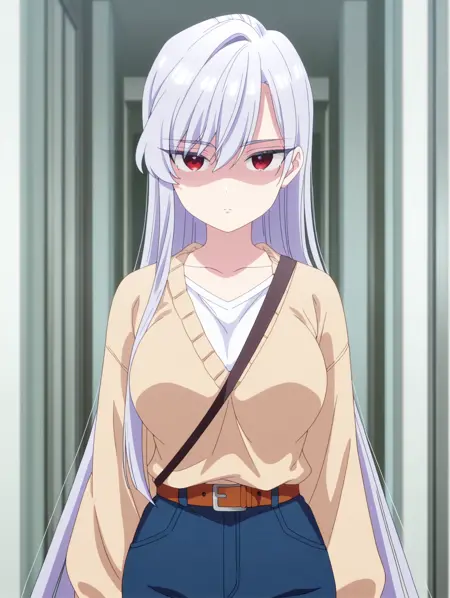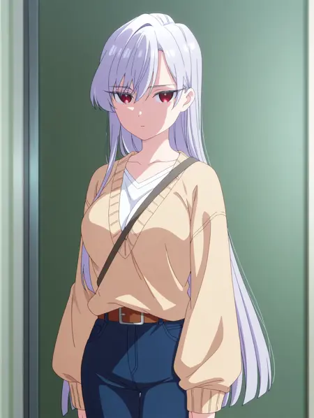 나노 일상복(복장), 청바지, 벨트, 흰색 셔츠, 노란색 스웨터,