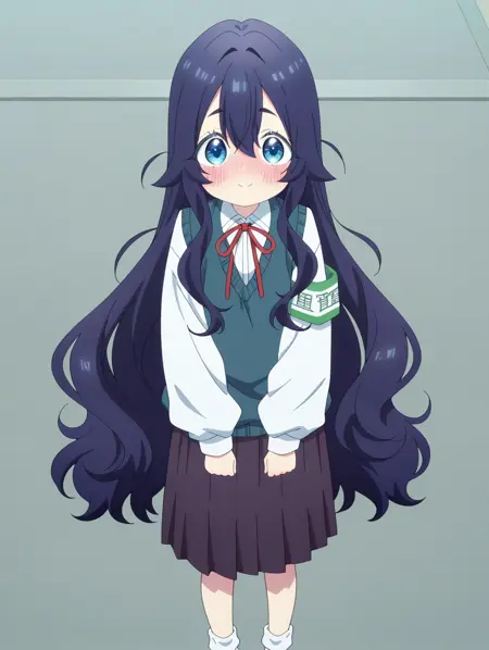 시즈카 요시모토(캐릭터), 파란색 눈, 진한 파란색 머리, 눈 사이의 머리카락, 평평한 가슴,