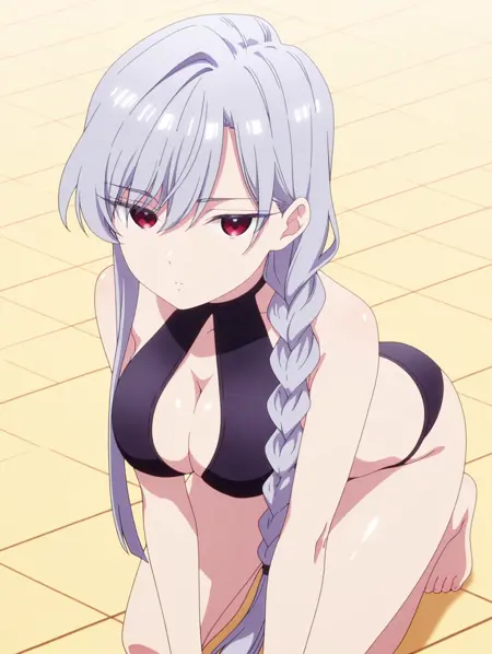 나노 수영복(복장), 수영복, 가슴 노출, 검정 비키니, 어깨 드러남, 의상 컷아웃, 맨발, 할터넥,