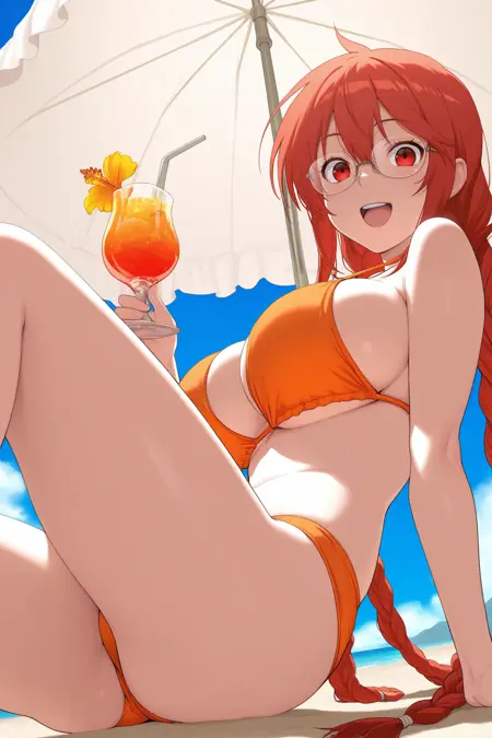 Trigger word is "skmtu" and "red eyes, long hair, red hair, braid" is required.