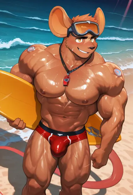 강화 프롬프트: "페리, 쥐 소년, 꼬리, 노란 눈, 흉터, 볼에 있는 흉터, 근육질, 남성스러운, 바라, 큰 가슴근"