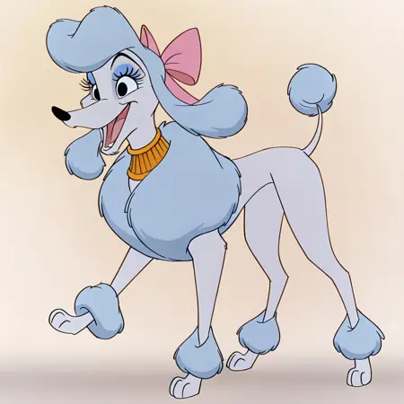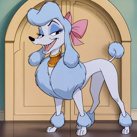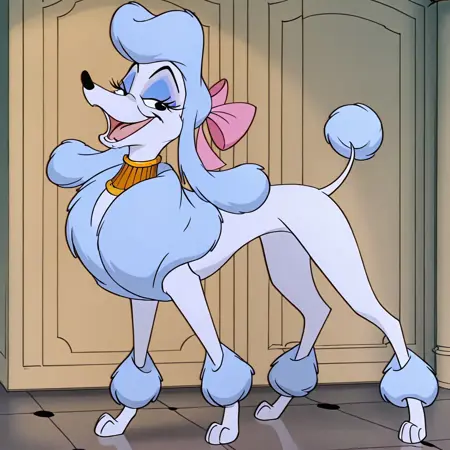 georgette, female, poodle, dog, disney, grey-white fur, light blue hair, light blue chest fur, light blue leg puffs on front legs, pink hairbow, golden collar, blue eyeshadow, black eyes