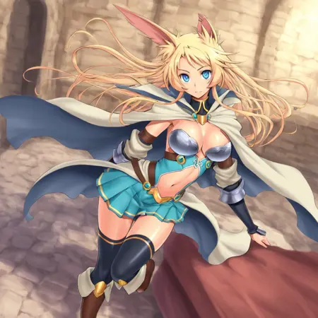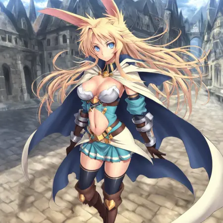 Trigger word: dgeleonora, blue eyes, blonde hair, long hair, animal ears, cape, breasts, navel,