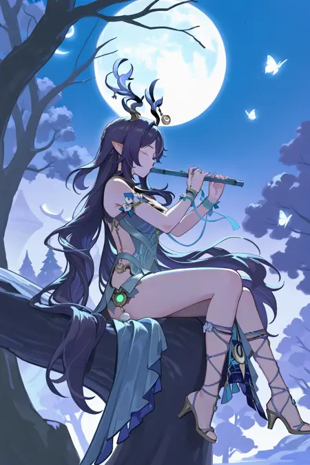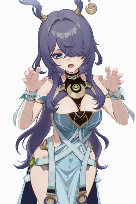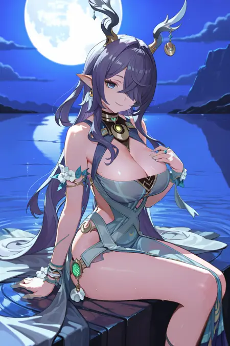 lauma \(genshin impact\), 1girl, horns, long hair, dress, jewelry, pointy ears, earrings, cleavage, bare shoulders, blue eyes, blue hair, crescent, blue dress, purple hair, bracelet, dragon horns