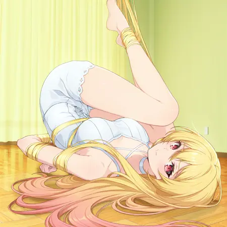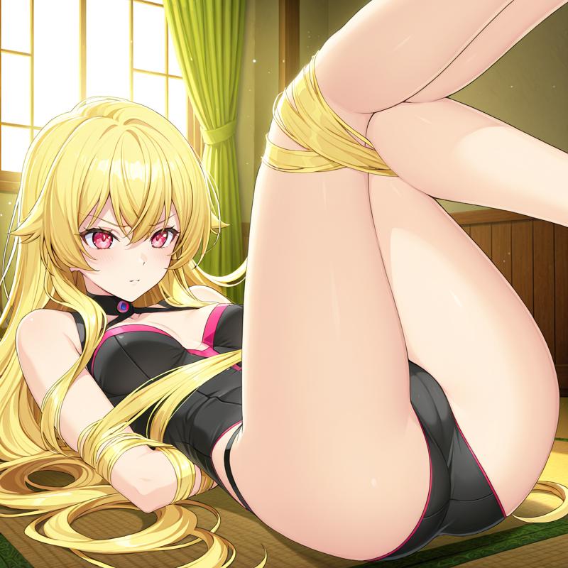 bound,hair bondage, long hair,dynamic pose, bound by own hair,arms on sides, bound body, bound arms, on back ,legs up