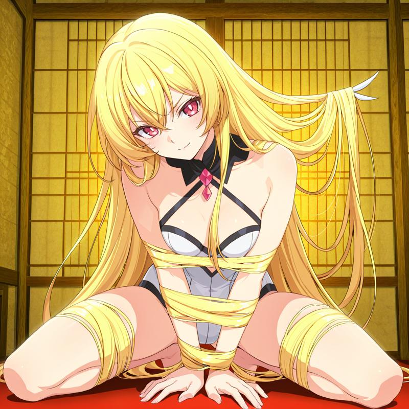 bound,hair bondage, long hair,dynamic pose, bound by own hair,arms on sides, bound body, bound arms