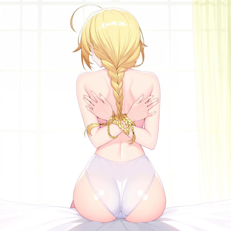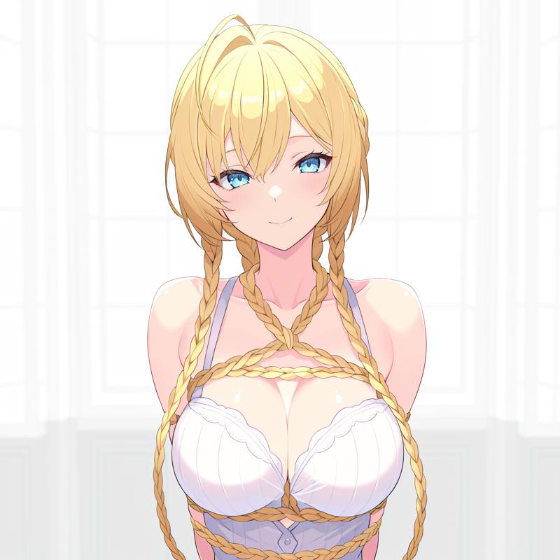 bound,hair bondage, braid,dynamic pose, bound by own hair,arms on sides, bound body, bound arms