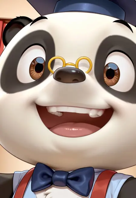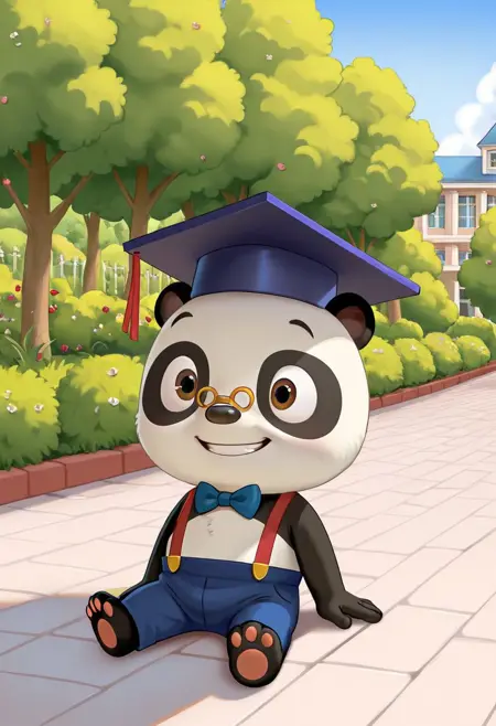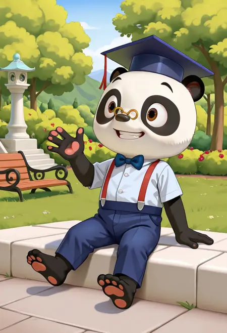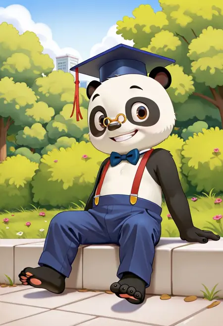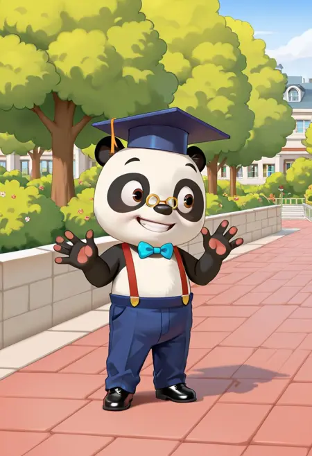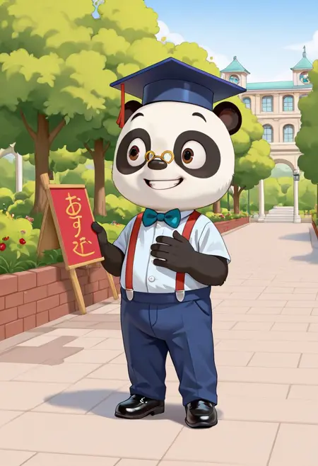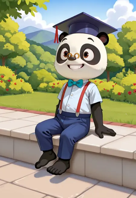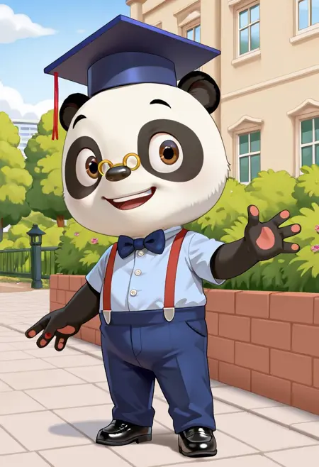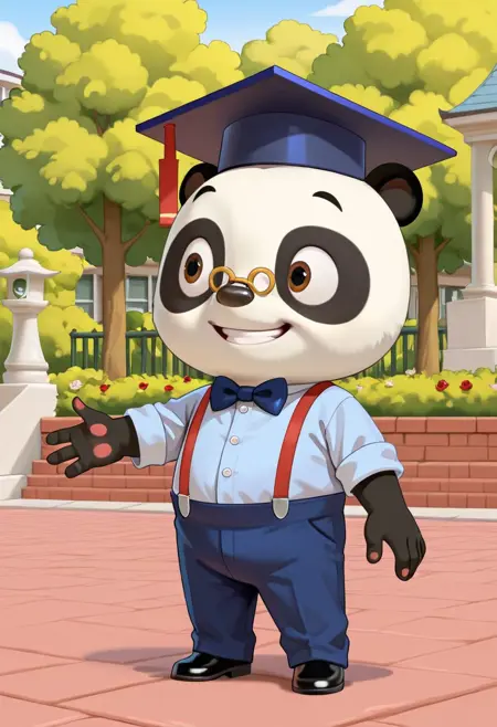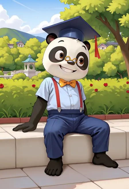 solo, 1boy, animal, furry, panda, Dr Panda, glasses, brown eyes, bowtie, graduate cap, standing
