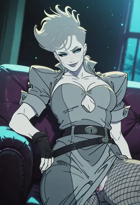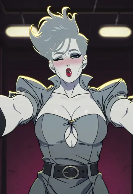 IceIvoryMC, 1girl, solo, pale skin, grey hair, pompadour, short hair, eyeshadow, blue eyes, full lips, lipstick, makeup, cheekbones, collarbone, high collar, grey dress, cleavage, large breast, cleavage cutout, belt, thick thighs, short sleeves, fishnets pantyhose, black shoes, high heels, whip, fingerless gloves,