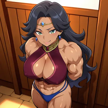GSAmazonWarrior, 1girl, solo, dark-skinned female, muscular female, large breasts, green eyes, black hair, long hair, circlet, blue gem, collar, earrings, jewelry, bracer, bikini armor, halterneck, crop top, blue panties, fingerless gloves