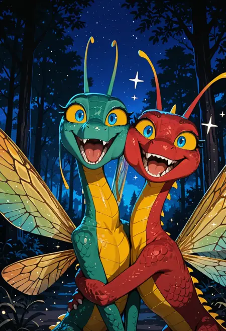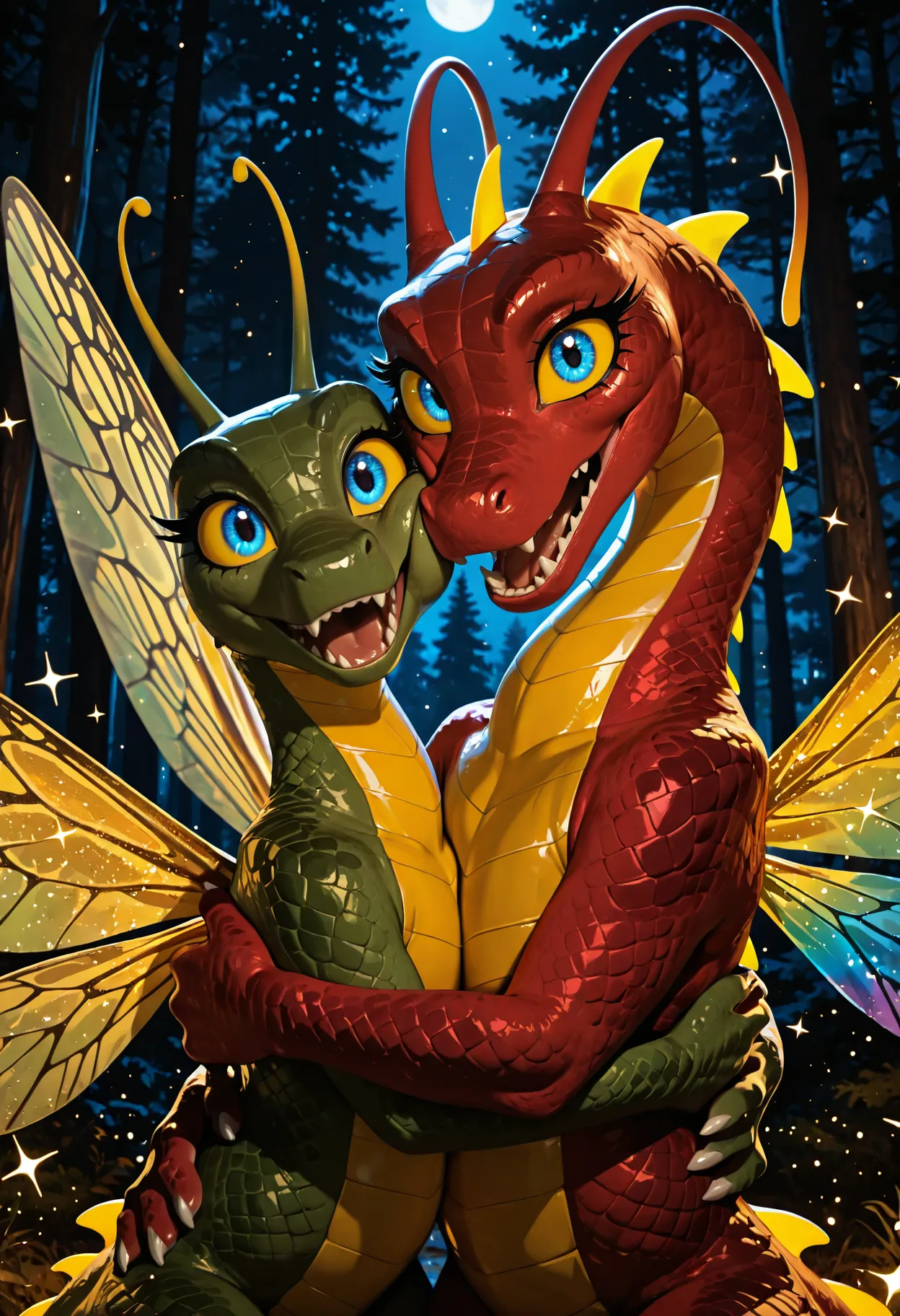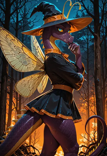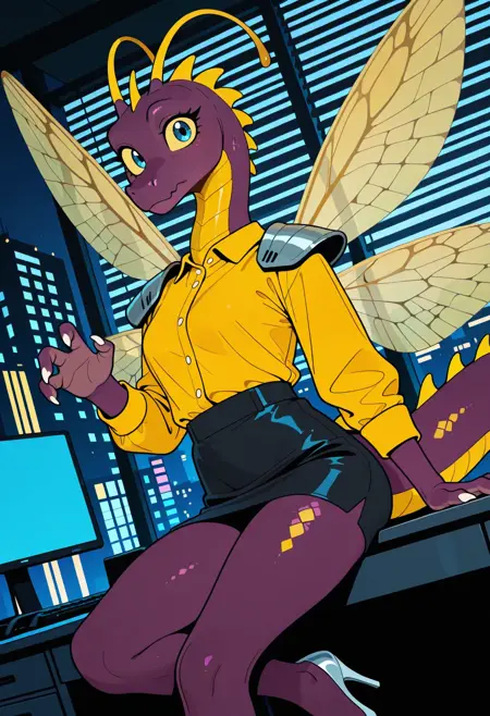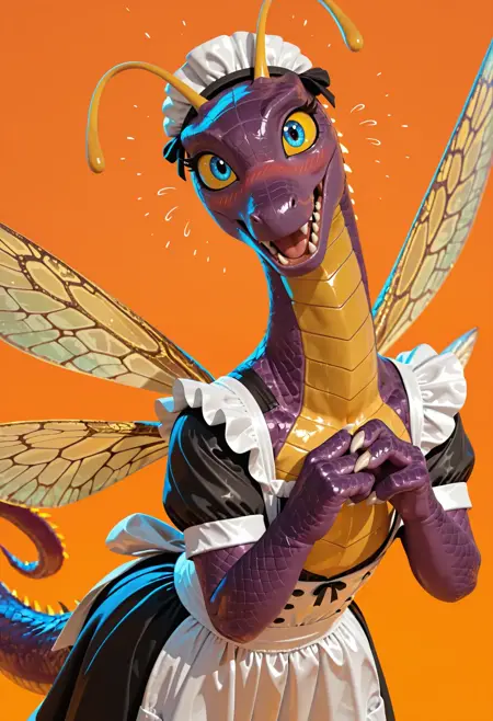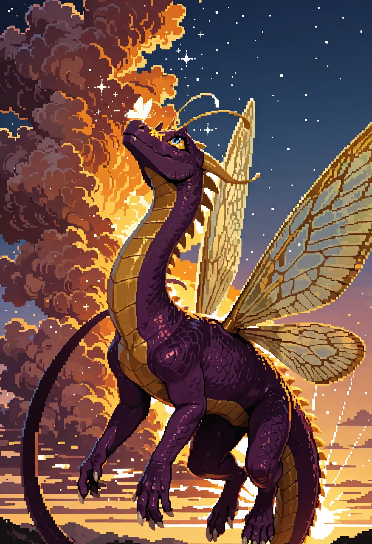 페어리 드래곤, 드래곤, 보라색 비늘, 뿔, 파란 눈, 노란 공막, 흰 발톱, 노란 액센트, (노란 배:0.5), 인간형, 곤충 날개, 꼬리,