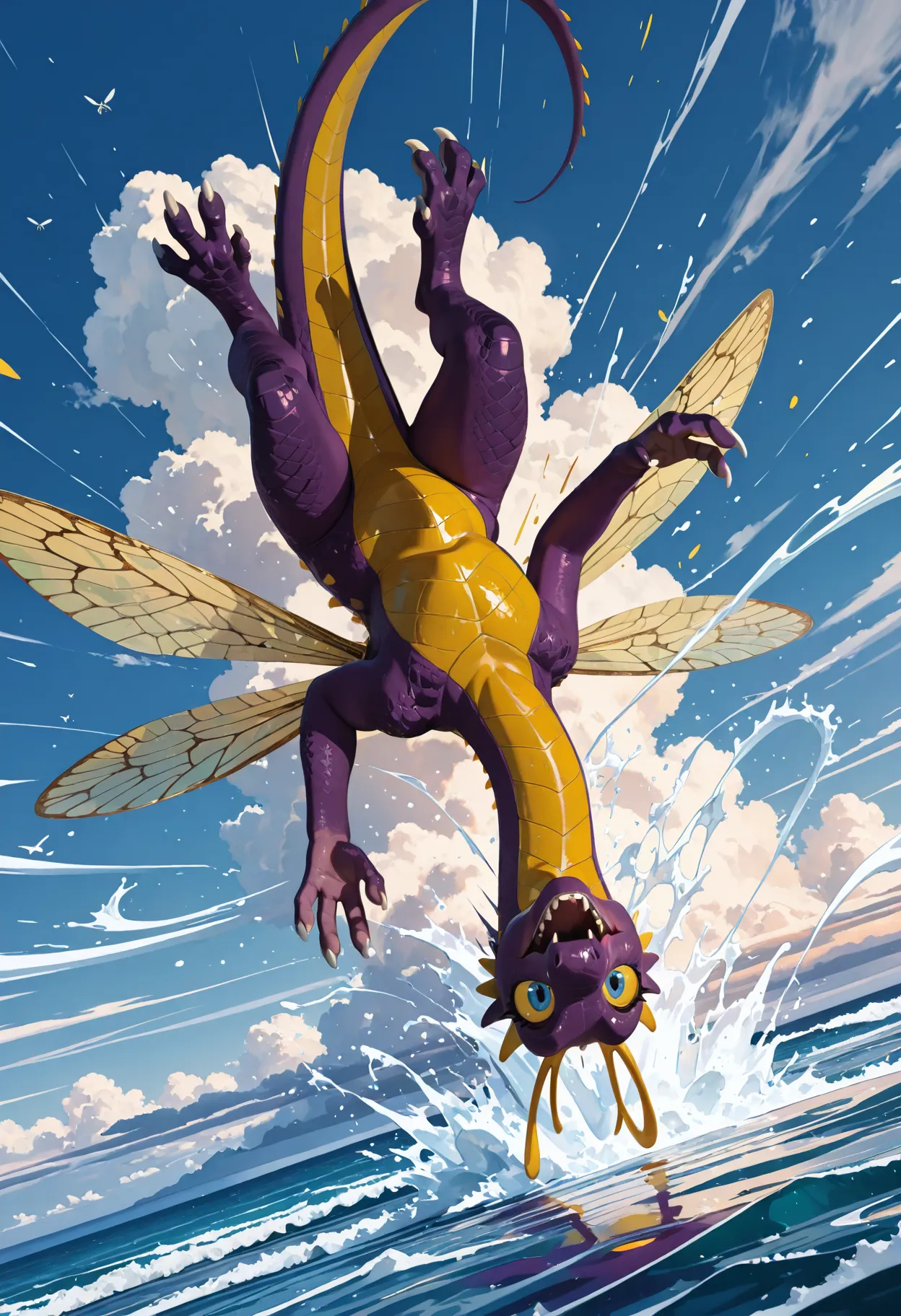 페어리 드래곤, 드래곤, 보라색 비늘, 뿔, 파란 눈, 노란 공막, 흰 발톱, 노란 액센트, (노란 배:0.5), 야생, 곤충 날개, 꼬리,