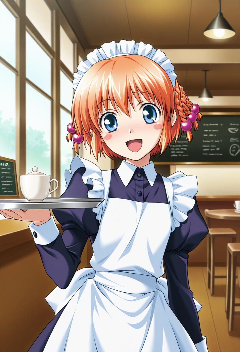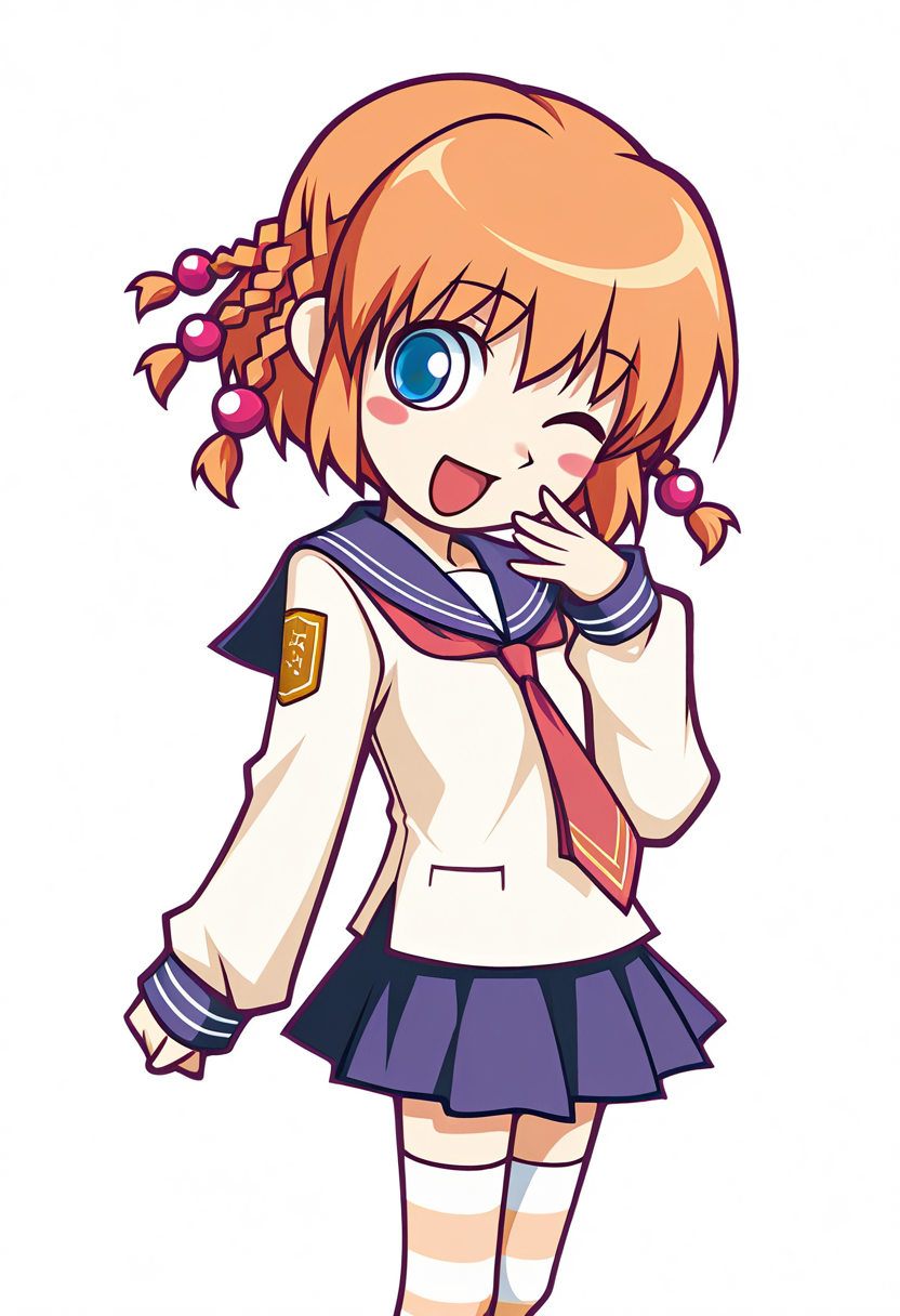 트리거 단어: k@n1sawa_k1nu, 땋은 머리, 단발, 주황색 머리, 파란 눈, 머리 장식, 뺨 스티커