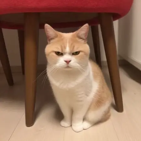 プロンプト: WD、私たちの愛らしいジンジャー・タビー猫をご紹介します。どんな家庭にも魅力を加えるのに最適です。このかわいらしい短毛猫は、明るいジンジャー色と白の美しい混合毛色を持ち、鋭い黄色の目が表情豊かで警戒心のある印象を与えています。小さくて優しい性格のため、家族やアパート暮らしの方々に理想的なペットです。猫は、黒い木製の脚と赤いクッション付き座面の、スリムでモダンな椅子に自然に座っています。明るい色の木製床が、シーンに温かく招き入れる雰囲気を加えています。手間がかからず、愛情深い仲間を探している猫好きの方々に最適です。