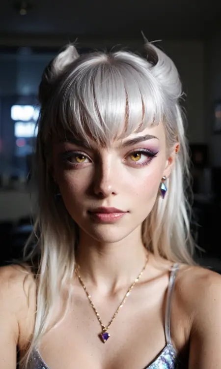 - k/da all out evelynn、黄色い目、白い髪、鋭い前髪、短めのジャケット、青いジャケット、へそ、開いた服、長い髪、短めのジャケット、青いジャケット、胸ハーネス、黒いトップス、黒いスカート、黒い太ももハイズ
