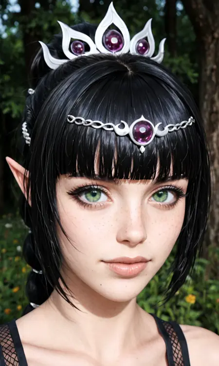 - shadowheart_(博德之门),黑发,绿眼,尖耳,齐刘海,发饰,编发马尾,长发,王冠,紫色宝石,多股绑发,黑色上衣,无袖上衣,露胸设计,中央开衩,多股绑发,黑色长裤
