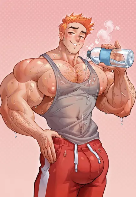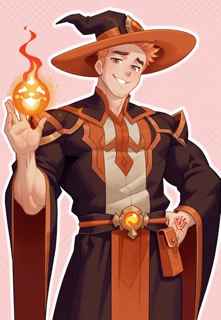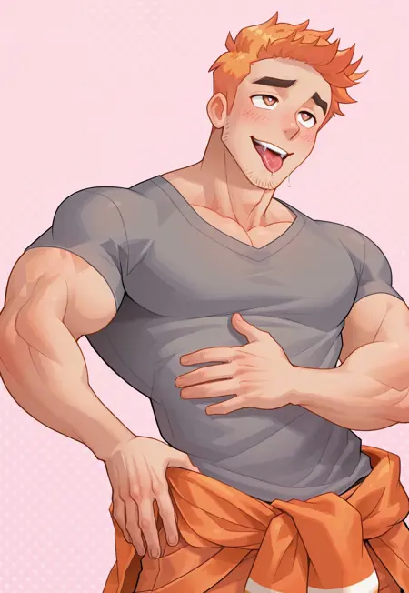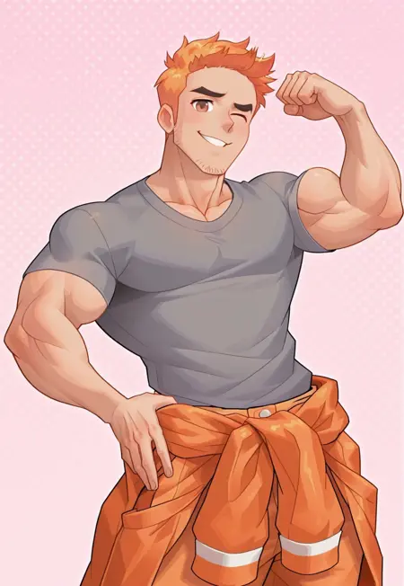 orange firefighter uniform, grey shirt, orange pants, brown shoes