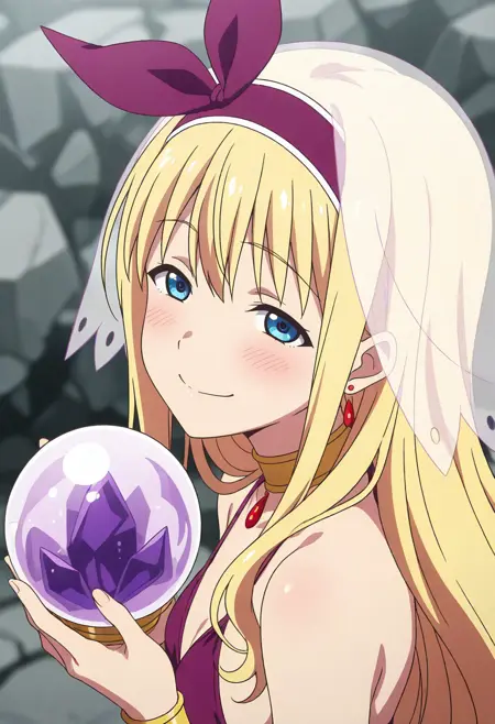 服装(ルリグ衣装):remember_costume, purple hairband, yellow choker, red jewerly, veil, red earrings, purple bikini, yellow wristband, multi-strapped bikini bottom, pink and white skirt