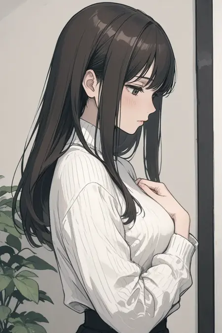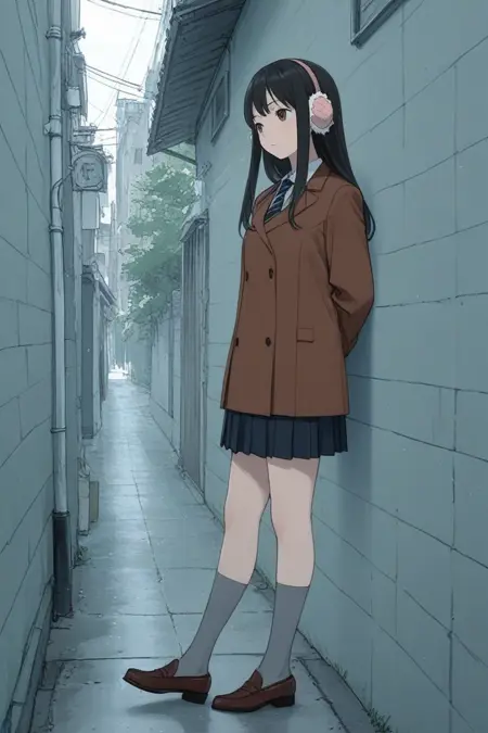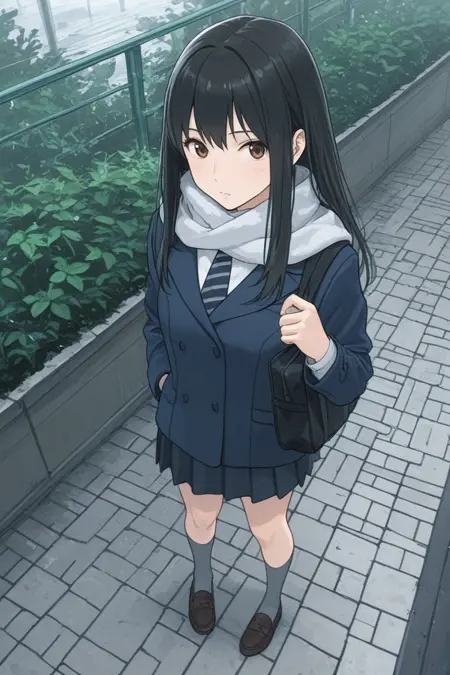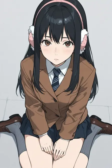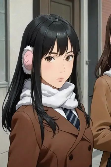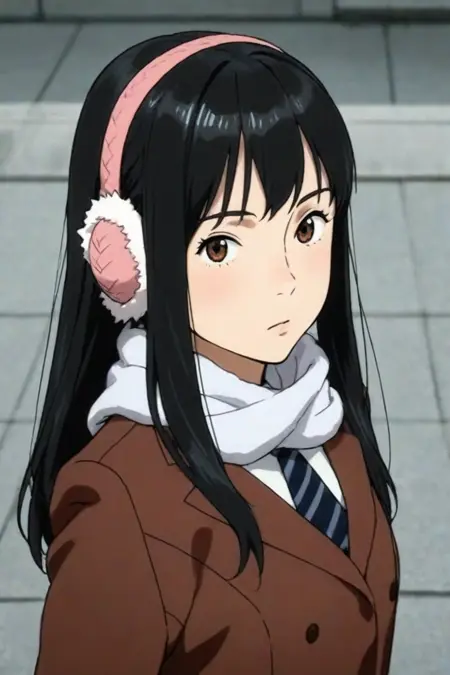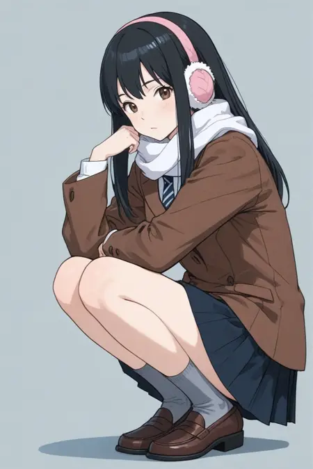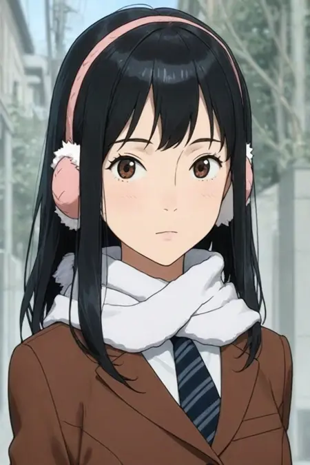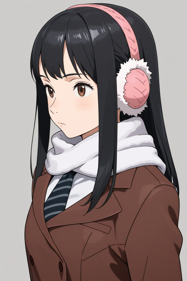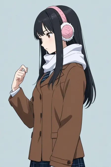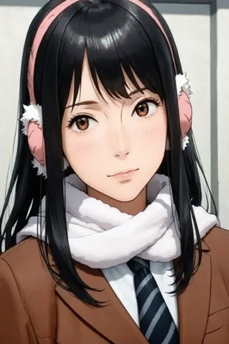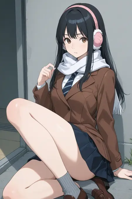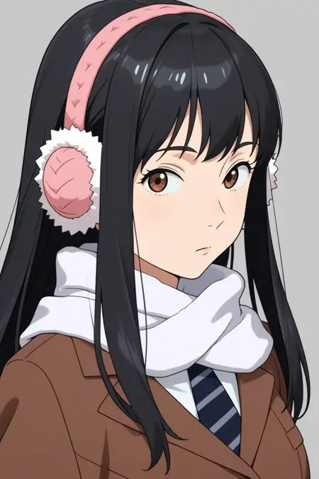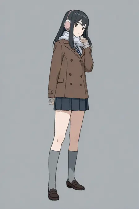 kana_kimishima,black hair,sidelocks,brown eyes,pink earmuffs,scarf ,striped necktie,brown blazer,pleated skirt,grey socks,loafers,