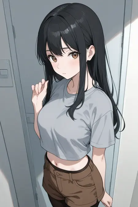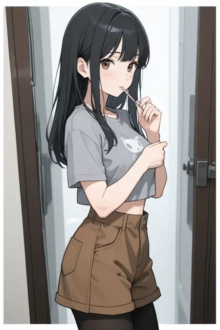 kana_kimishima,black hair,sidelocks,brown eyes, cropped shirt,brown shorts,black pantyhose