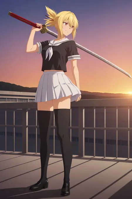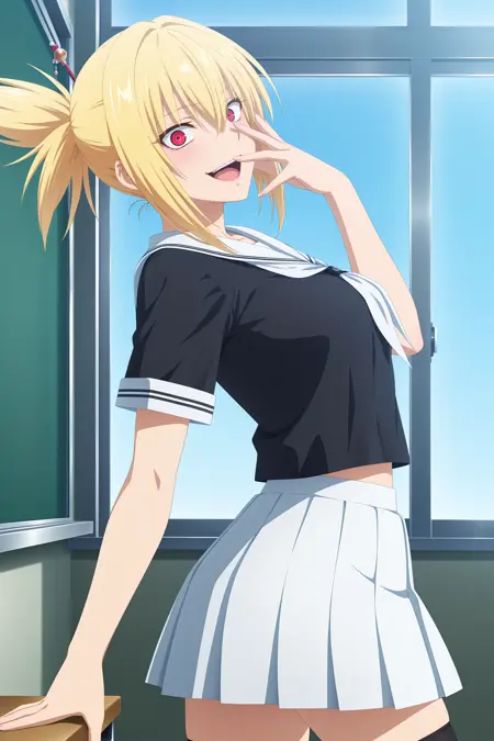 suzuka, 长发, 金发, 宽马尾, 发簪, 侧发, 参差不齐的刘海, 头发遮住眼睛, 红眼, 短袖, 黑色上衣, 白色水手领, 白色领巾, 白色裙子, 百褶裙, 黑色过膝袜, 黑色鞋子, 乐福鞋