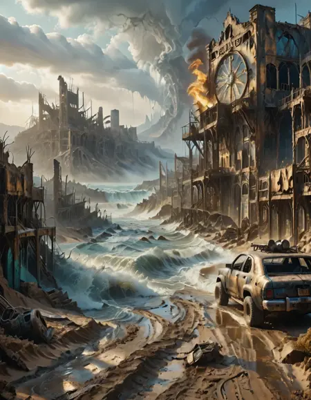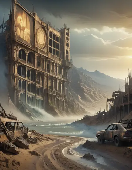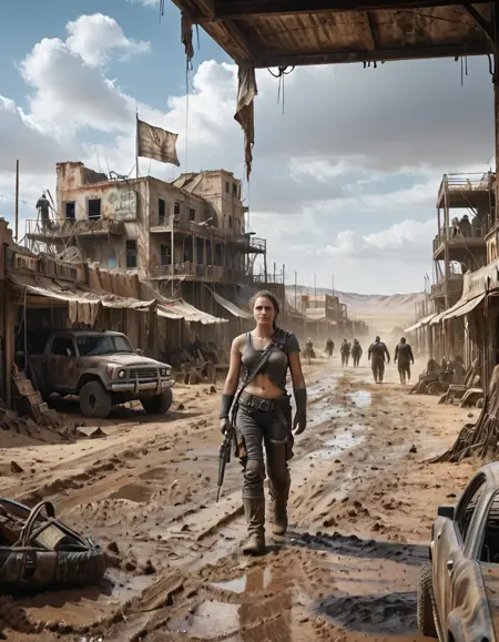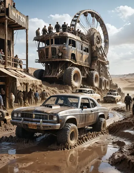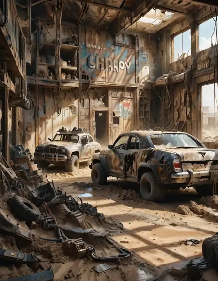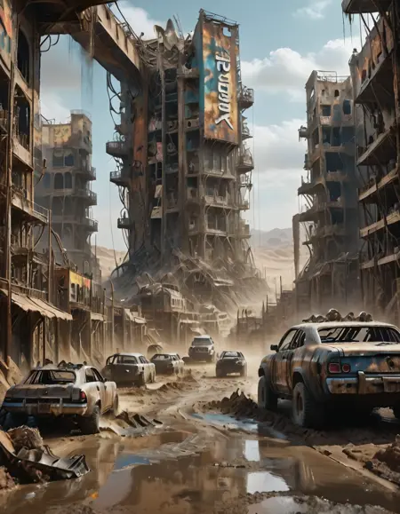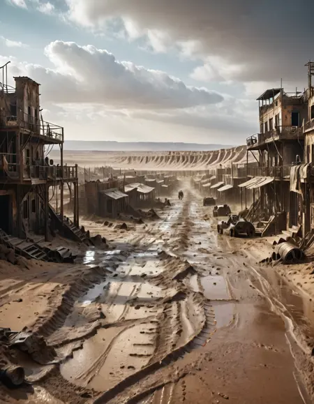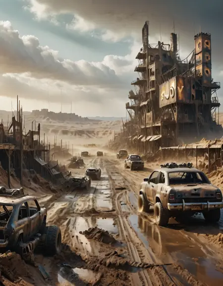 マッドマックス風の都市、家、店舗、車両。砂と泥。