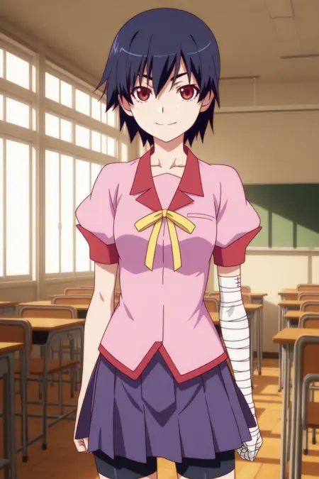 aasuruga, brown eyes, black hair, short hair, bandaged arm, surugaschool, pink shirt, yellow ribbon, puffy short sleeves, purple skirt, pleated skirt, bike shorts under skirt, anime coloring,