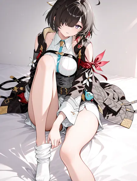私たちのパティシエ(everyone's_favorite_patissier):yumia liessfeldt \(everyone's favorite patissier\), 片方の目に髪が垂れ下がっている、目の下にほくろ、結ばれた尻、アンダーブスト、デニムショートパンツ、