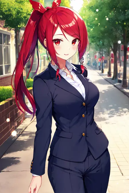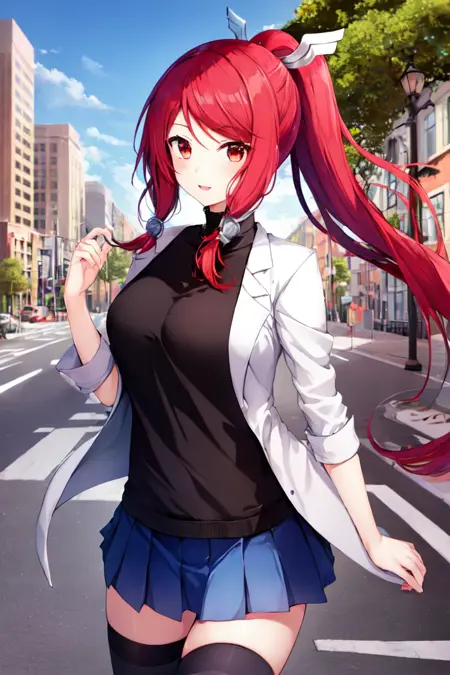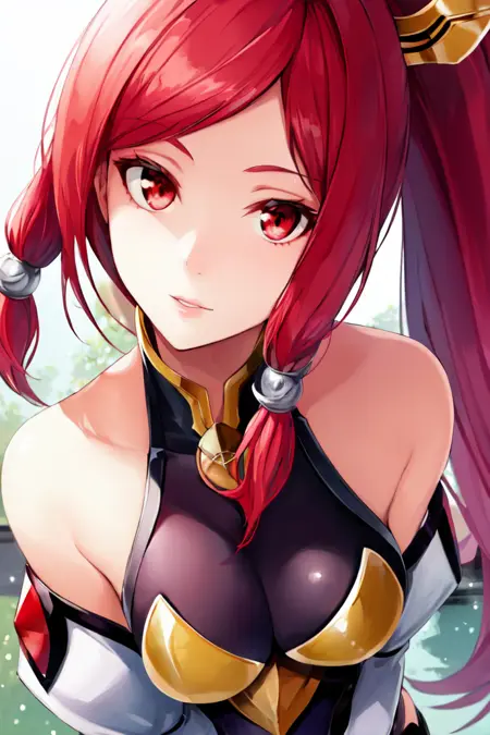 Izayoi (blazblue), 오렌지색 눈, 빨간 머리, 단추 빗질 머리, 긴 머리, 큰 가슴, 갑옷, 바디수트, 부츠 와 함께 사용되며, 기본 의상과 일반적으로 잘 어울리는 요소는 큰 가슴, 피부에 딱 맞는 옷, 스커트, 허벅지 부츠, 허벅지 길이 양말 입니다.