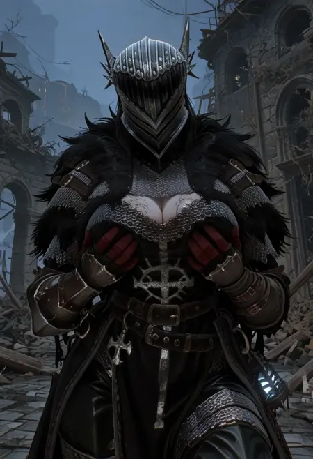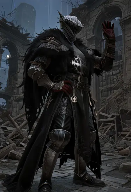 LOTF_vanguard, 헬멧, 사슬갑옷, 털 장식, 검은 투바드, 검은 망토, 장갑, 검은 바지, 부츠