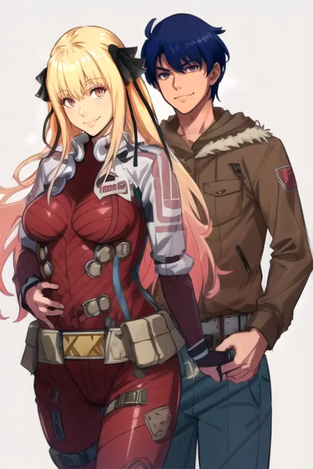 JoshuaShatte, a man and (a woman, bodysuit), hetero, standing, smile, cowboy shot