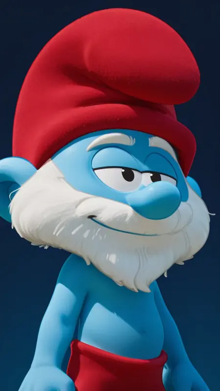 Smurfs2025,老爷爷蓝精灵,蓝色皮肤,白色胡须,红帽子,红裤子,红鞋子(或:红色胡须)