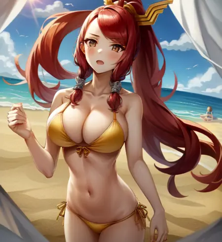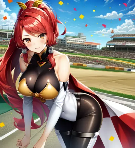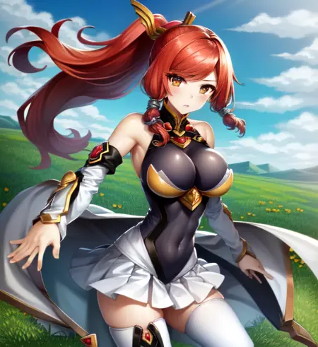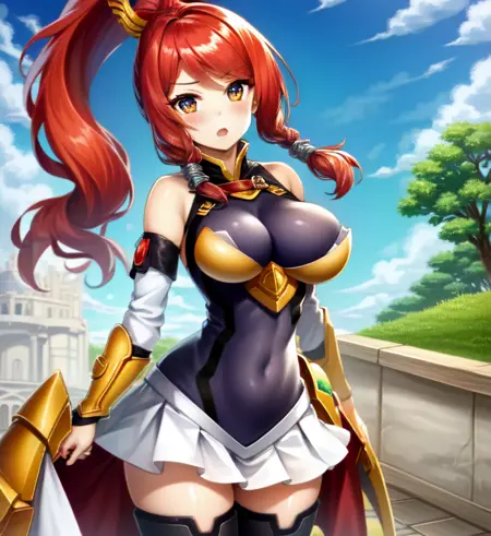 触发词:Izayoi (blazblue), 橙色眼睛, 红发, 马尾, 长发, 大胸, 动作服, 铠甲, 靴子,通常与 大胸, 贴身, 短裙, 大腿靴, 长袜 搭配良好,为其默认服装。