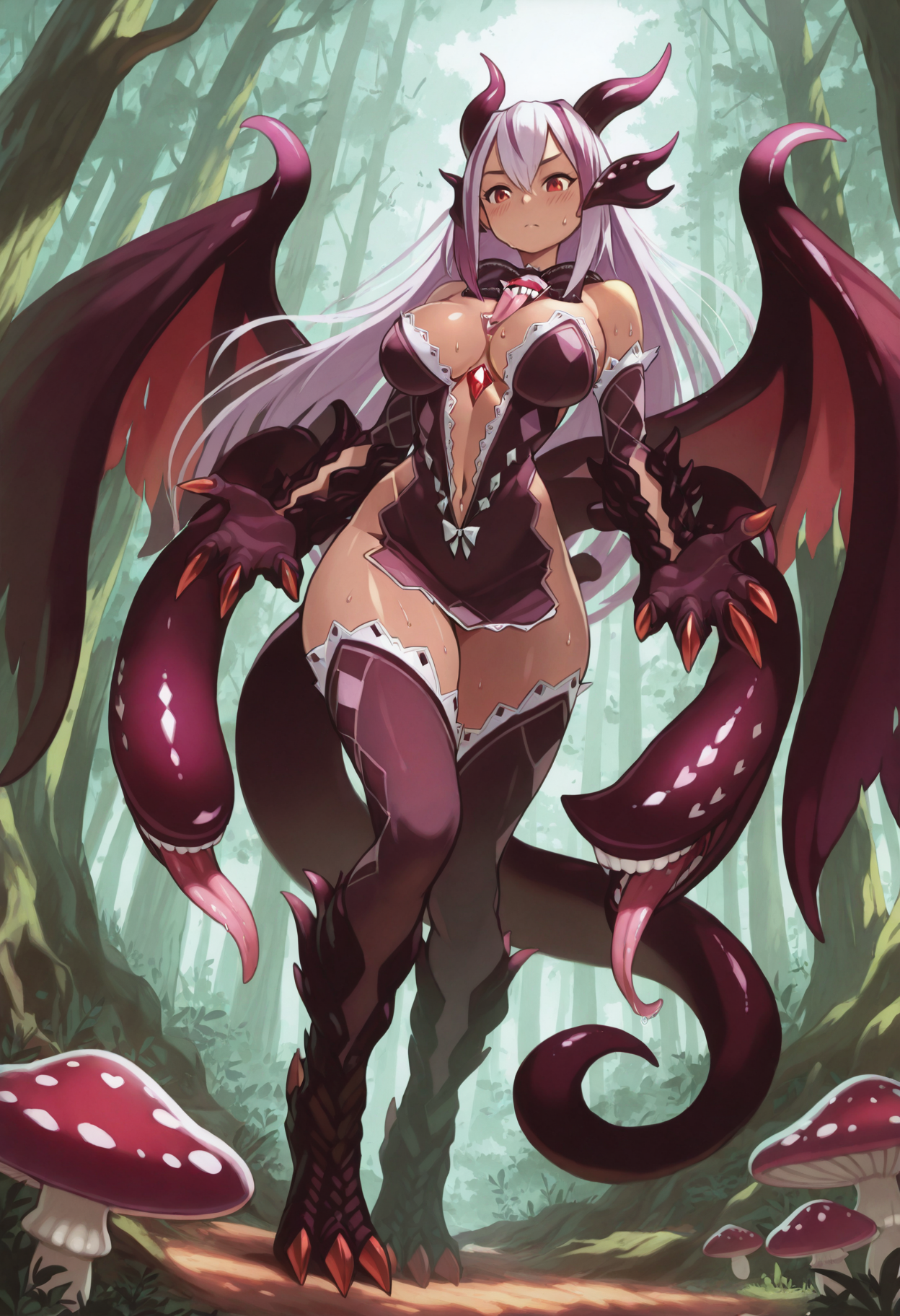 jabberwockmge, 怪物女孩, 龙族女孩, 龙翼, 破损翅膀, 双色翅膀, 深粉红色翅膀, 头部鳍状物, 前臂鳞片, 鳞片手掌, 腿部鳞片, 鳞片脚掌, 抓握尾部, 深粉红色尾部, 龙爪, 龙足, 额外舌头, 额外嘴巴, 触手手臂