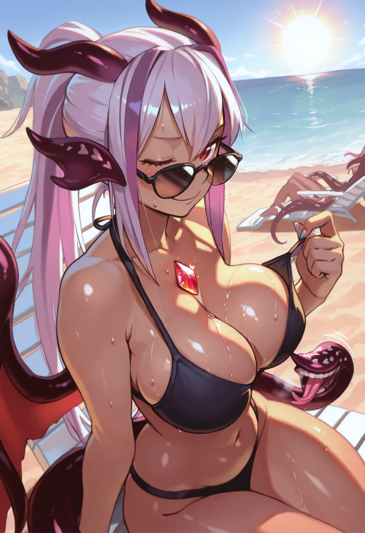 深色皮肤, 深肤色女性, 双色头发, 条纹发, 长发, 紫色头发, 粉色头发, 多彩头发, 侧发, 眼睛中间的头发, 红色眼睛, 大胸, 肚脐, 胸部线条, 裸露肩膀