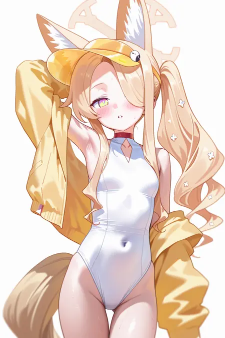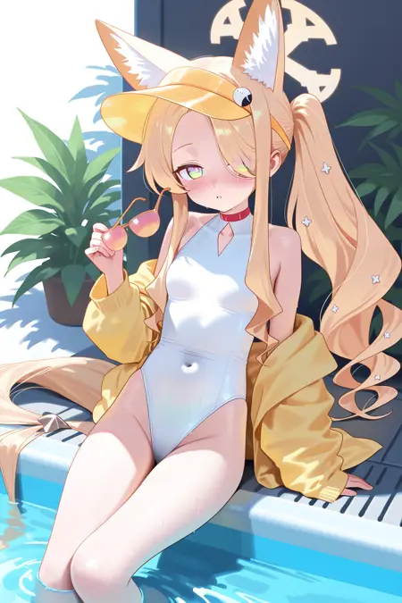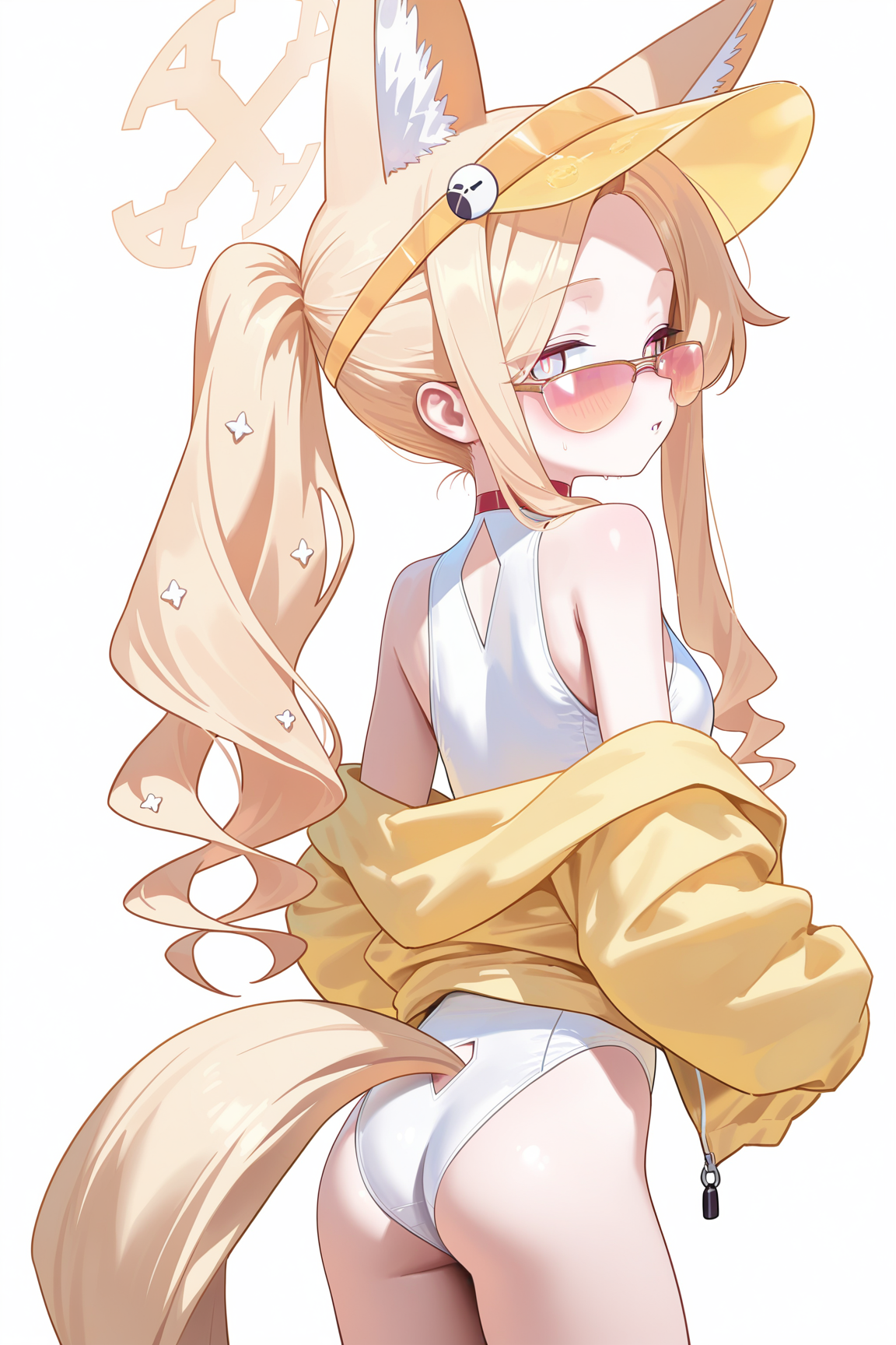 水着, ワンピース水着, 動物の耳, 白いワンピース水着, ビーサン帽, 金髪, 尾, ハロ, 長い髪, サングラス, 狐の耳, ジャケット, 追加の耳, 黄色いジャケット, 黄色い頭部装飾, 視聴者を見つめる, 代替衣装, 動物の耳のふわふわ, ほほ赤らみ, 開いた口, 代替ヘアスタイル, チョーカー, 色付き眼鏡, 側髪, ポニーテール, 狐の尾