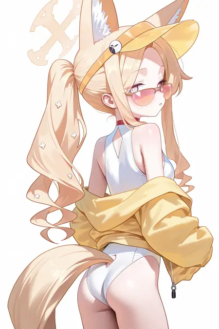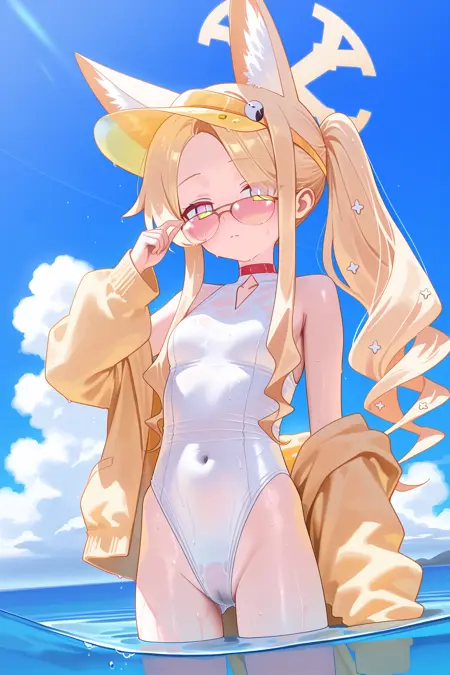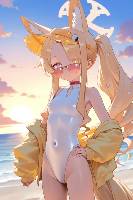 수영복, 원피스 수영복, 동물 귀, 흰색 원피스 수영복, 비전 캡, 금발 머리, 꼬리, 환상, 긴 머리, 선글라스, 여우 귀, 재킷, 추가 귀, 노란색 재킷, 노란색 머리장식, 시청자 바라보기, 대체 복장, 동물 귀 털, 뺨홍조, 벌어진 입술, 대체 헤어스타일, 목걸이, 색안경, 옆머리, 토끼 꼬리, 여우 꼬리